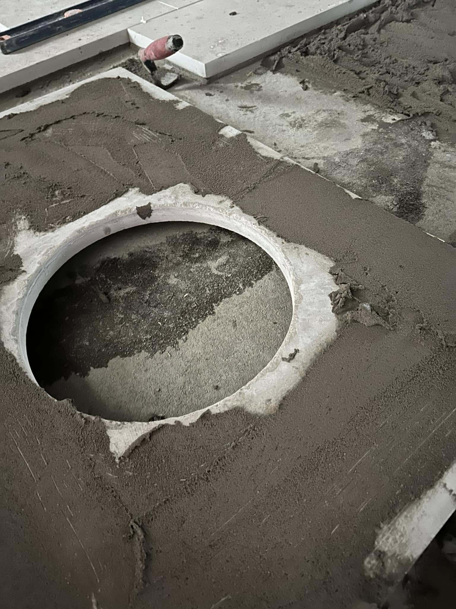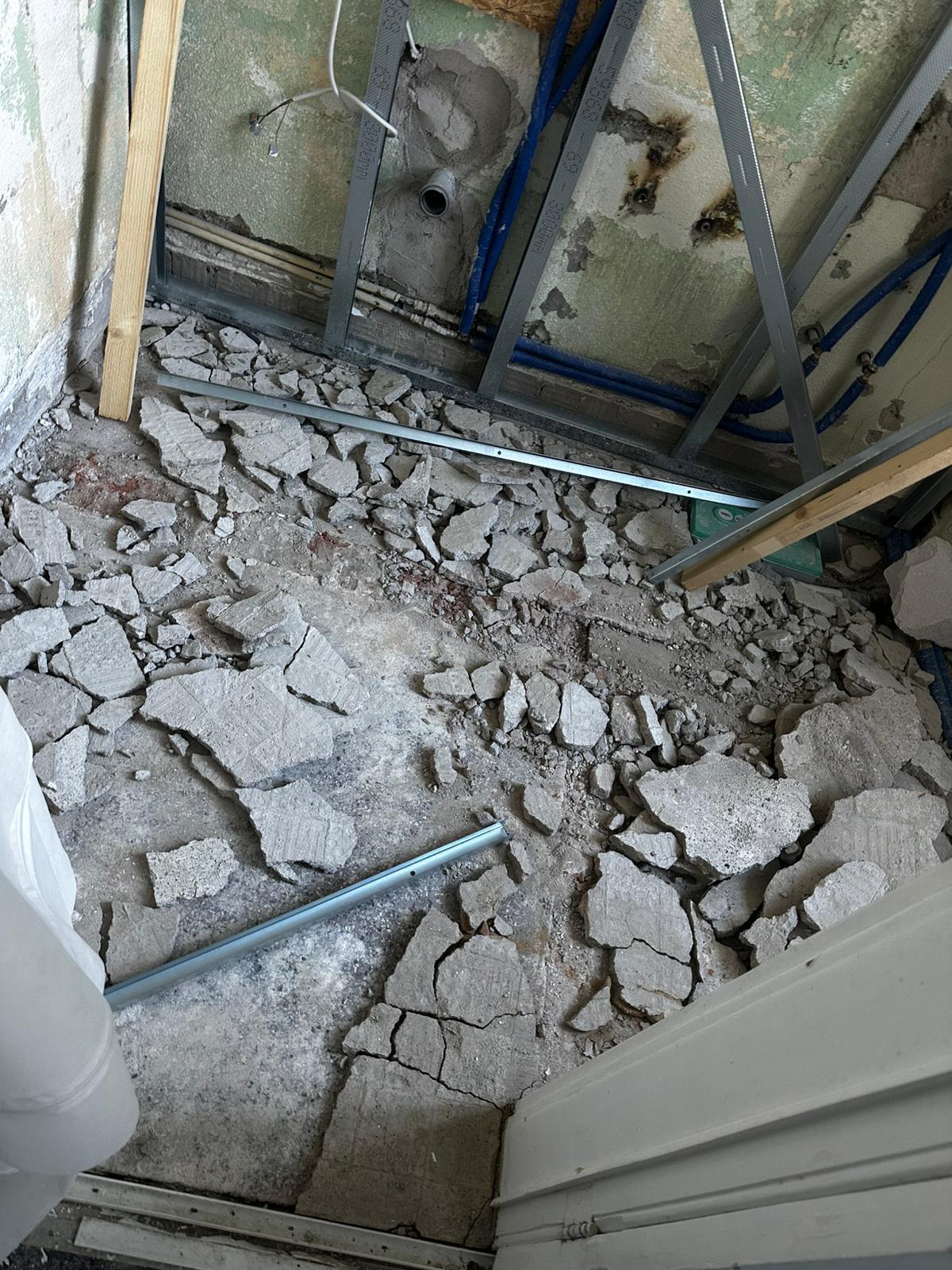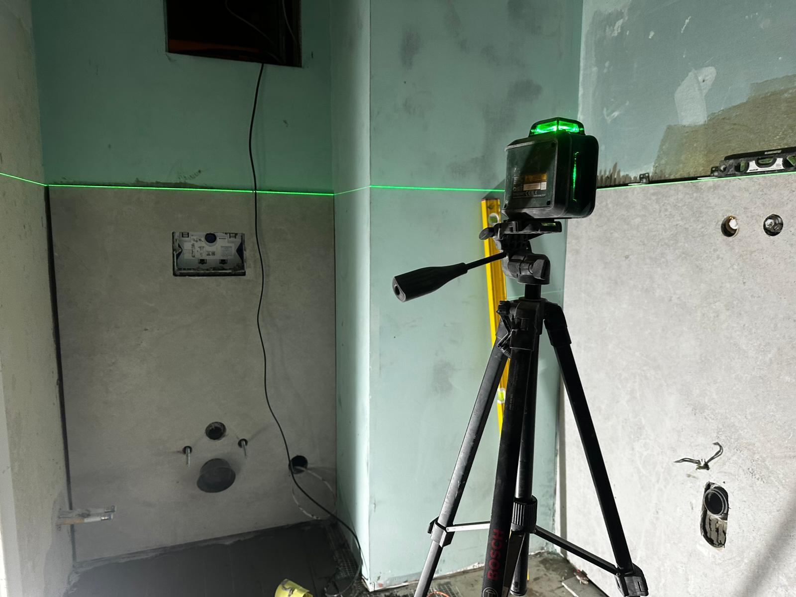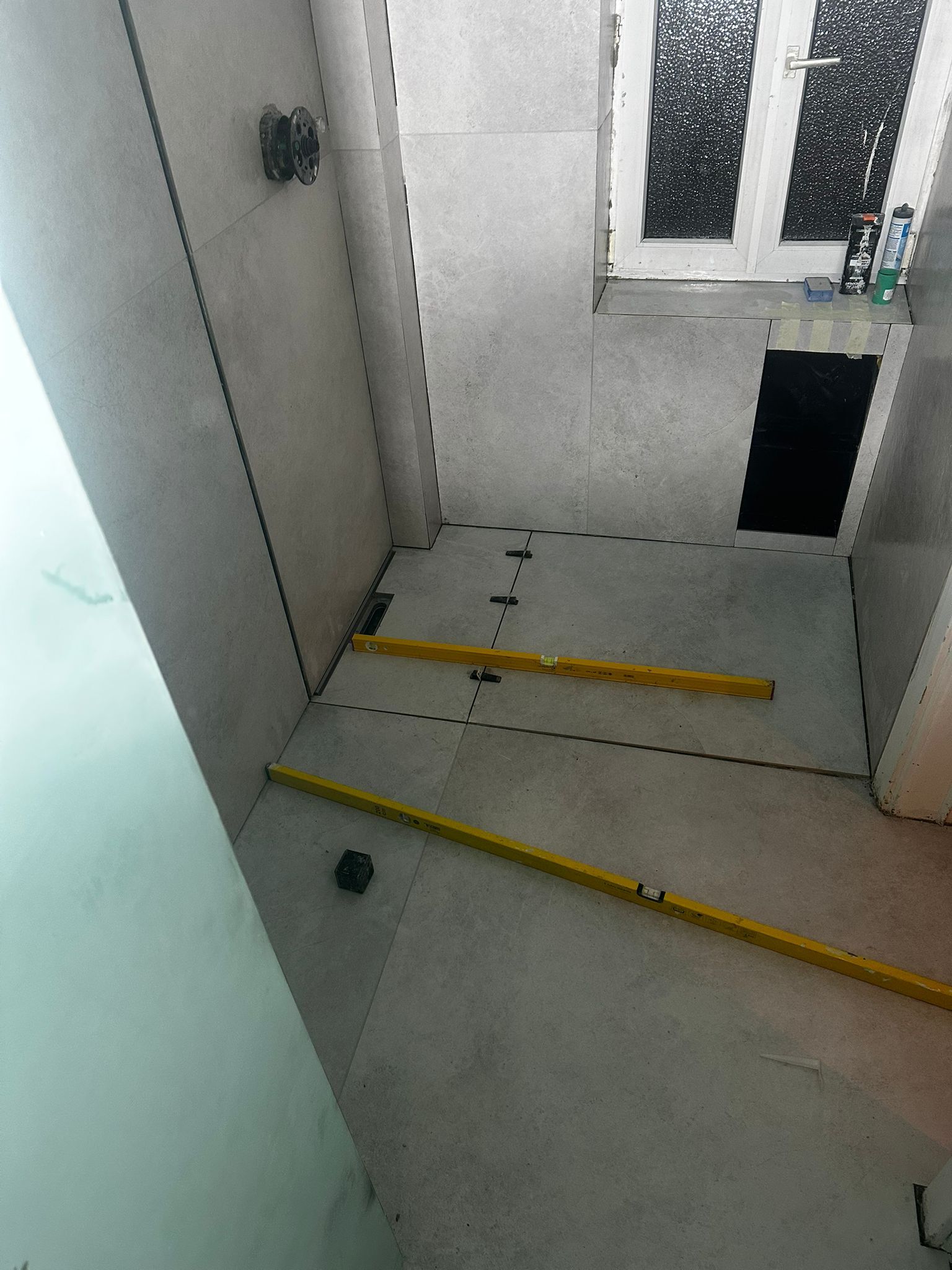 Komplette Badsanierung in Frankfurt am Main inkl. Demontage, Estrich-Abbruch, Untergrundvorbereitung und professioneller Abdichtung. Verlegung von 120×120 cm Großformat-Feinsteinzeug, Installation eines Linienablaufs, Laser-Nivellierung sowie GK-Verkleidung mit imprägniertem Uniflott. Präzise Ausführung, Sauberkeit und Pünktlichkeit – LUKPOL BS Badsanierung & Bauservice.